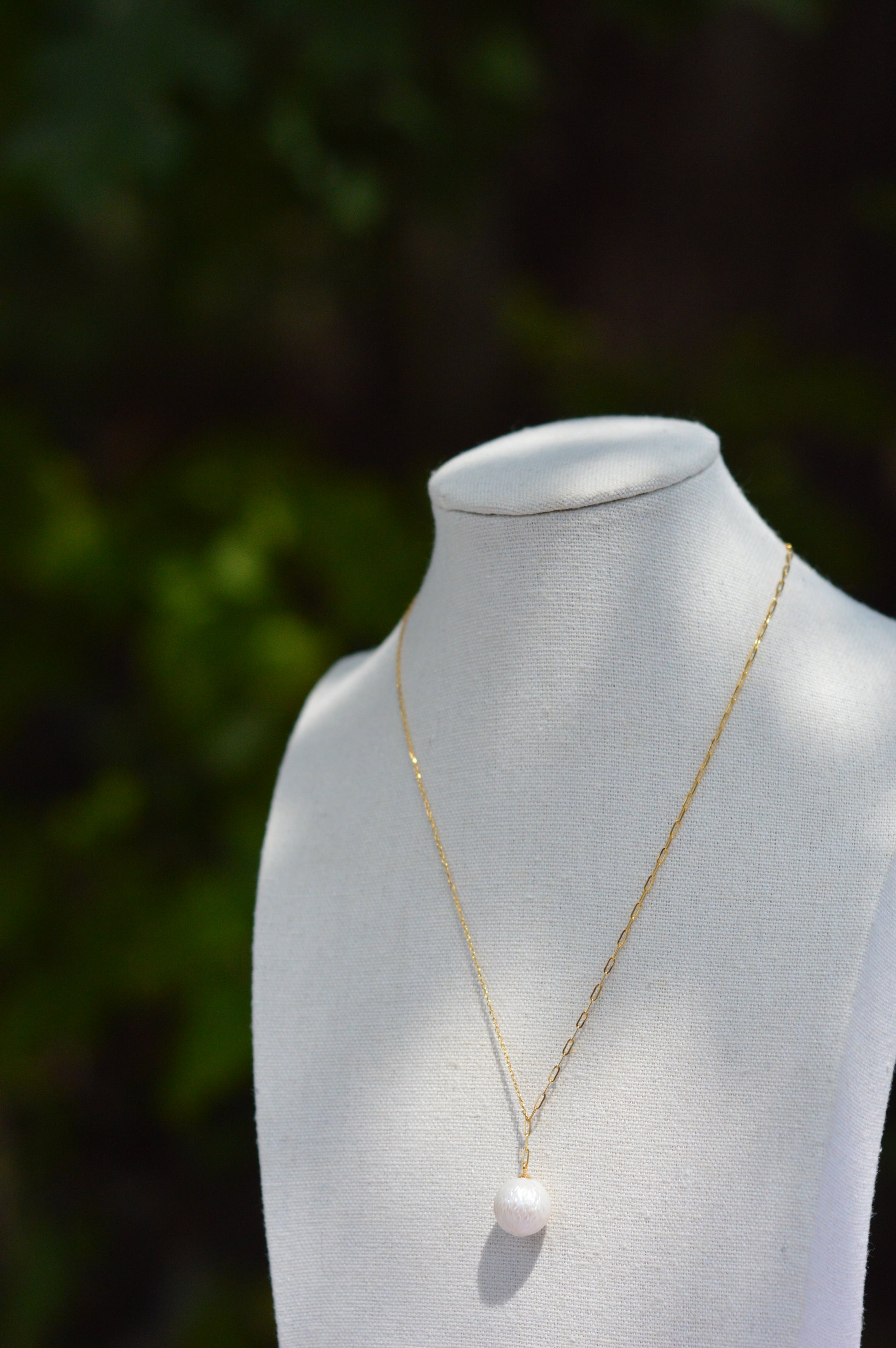 This necklace features a rare 12mm hand-carved White Edison pearl, with intricate detailing that enhances its natural light luster. Each pendant is unique, showcasing the artistry of the carving and the pearl’s natural beauty.