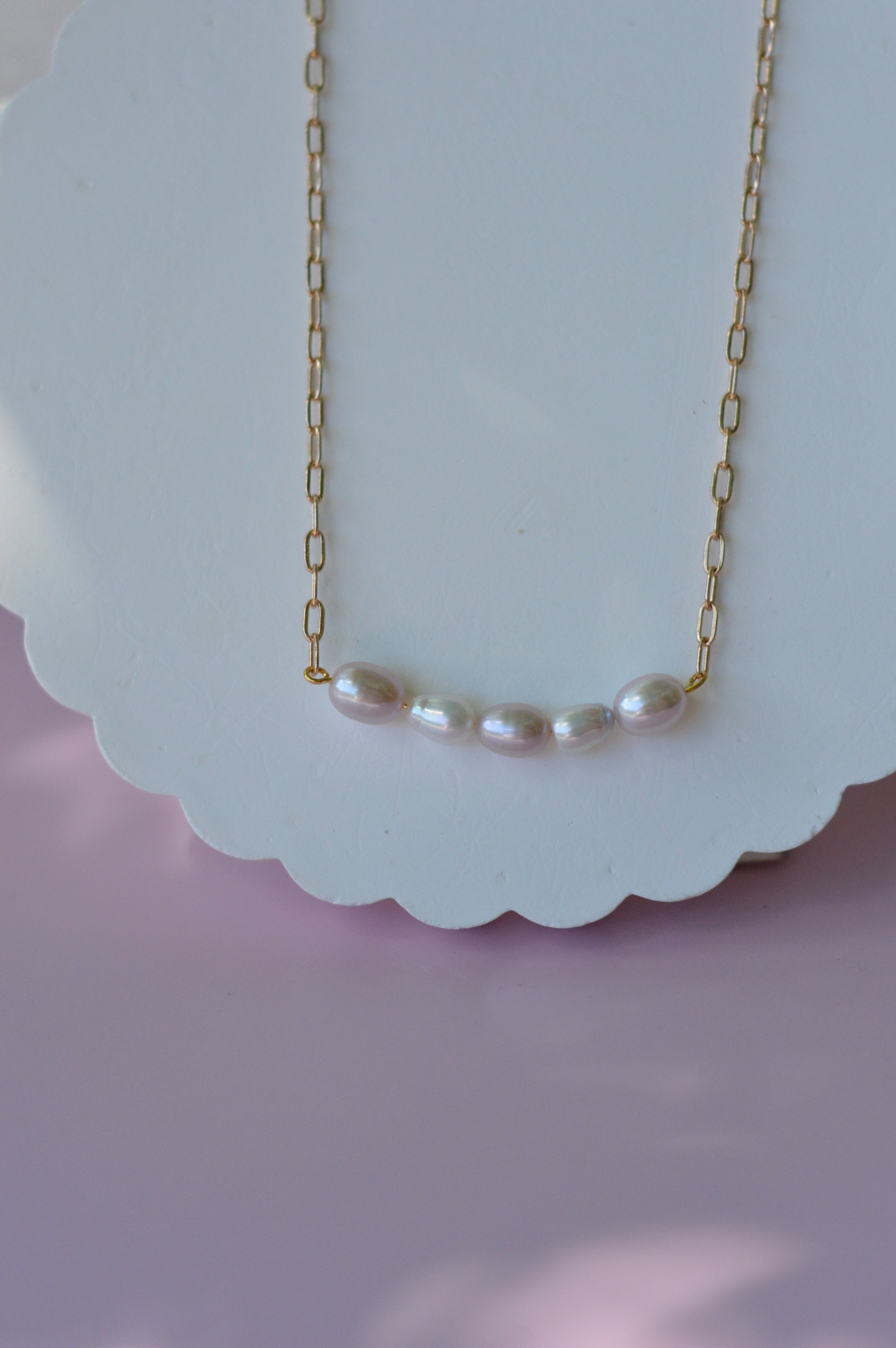 Add a touch of elegance to your everyday look with this timeless freshwater pearl necklace. Five natural pink and white pearls (approx. 6mm) are strung together in a minimalist design, creating a soft shimmer that pairs beautifully with the gold-plated chain. At 23 inches, it sits perfectly as a stand-alone piece or layered with shorter necklaces for a chic, modern style.