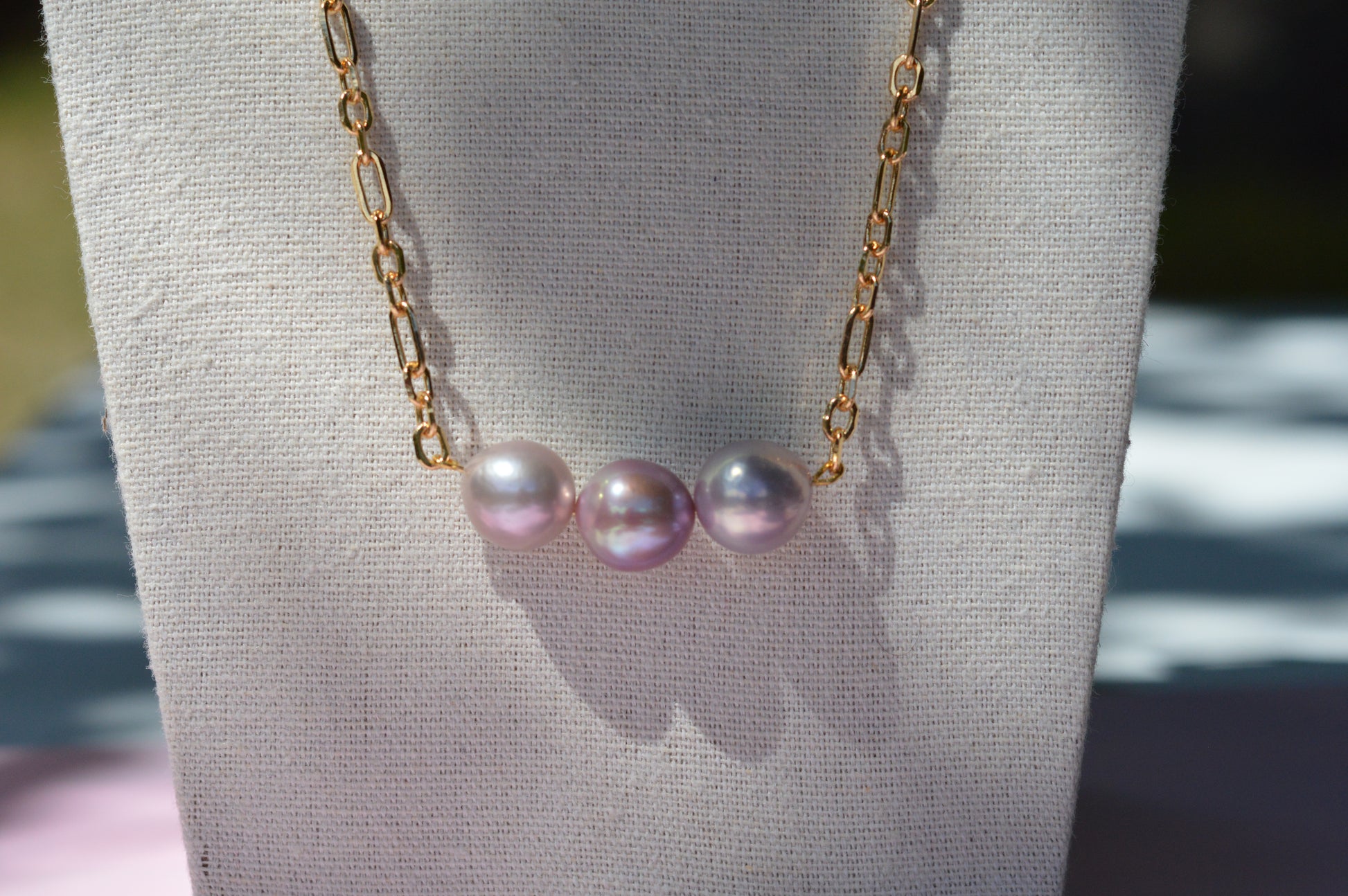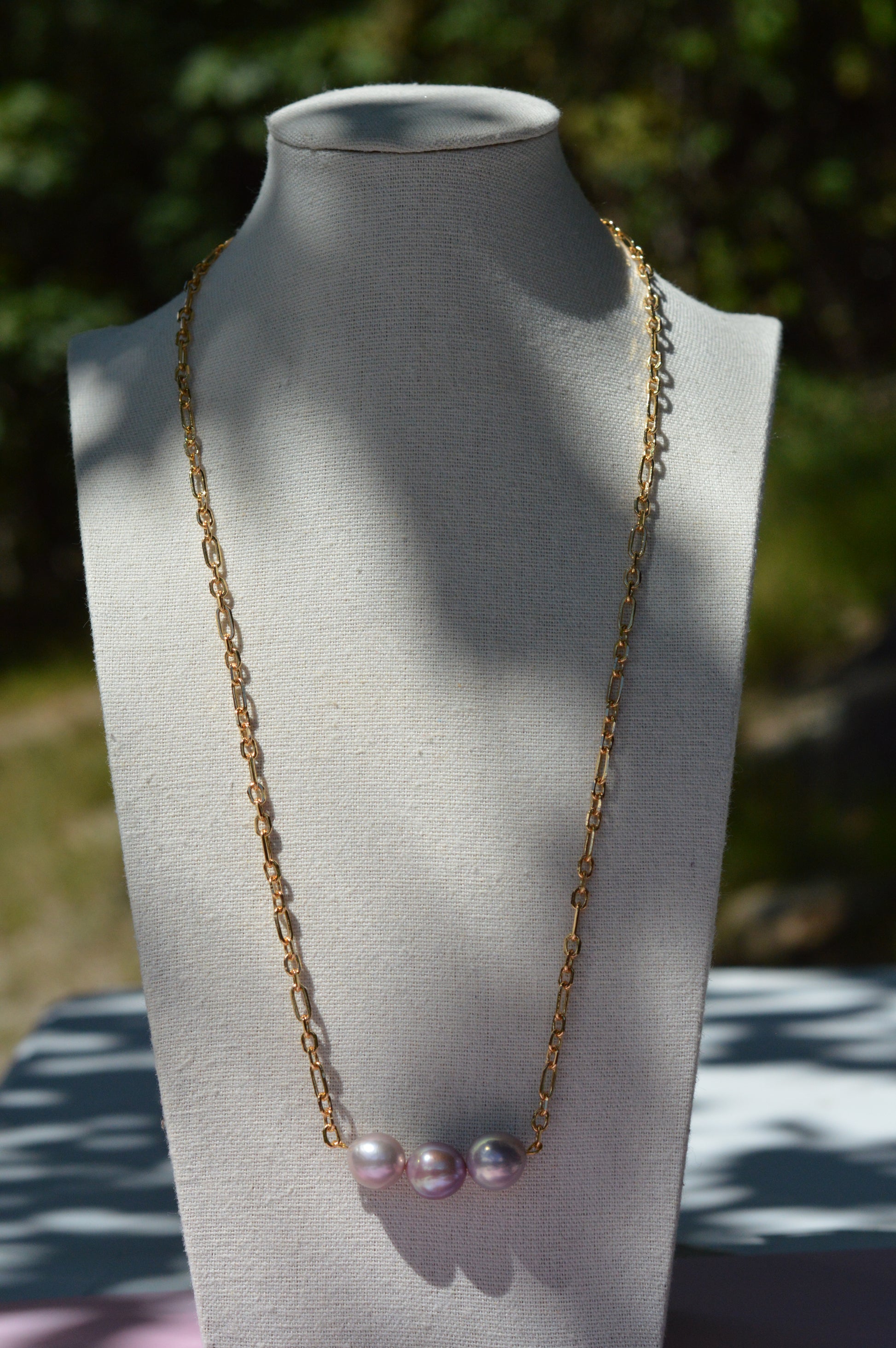 Soft, dreamy, and timeless – this necklace features three natural pastel Edison pearls (approx. 12.5mm each) glowing with a gentle mix of pink, lavender, and golden overtones. Their luminous finish pairs beautifully with the warm shine of a 23-inch gold plated chain, creating an elegant piece that transitions seamlessly from day to night.