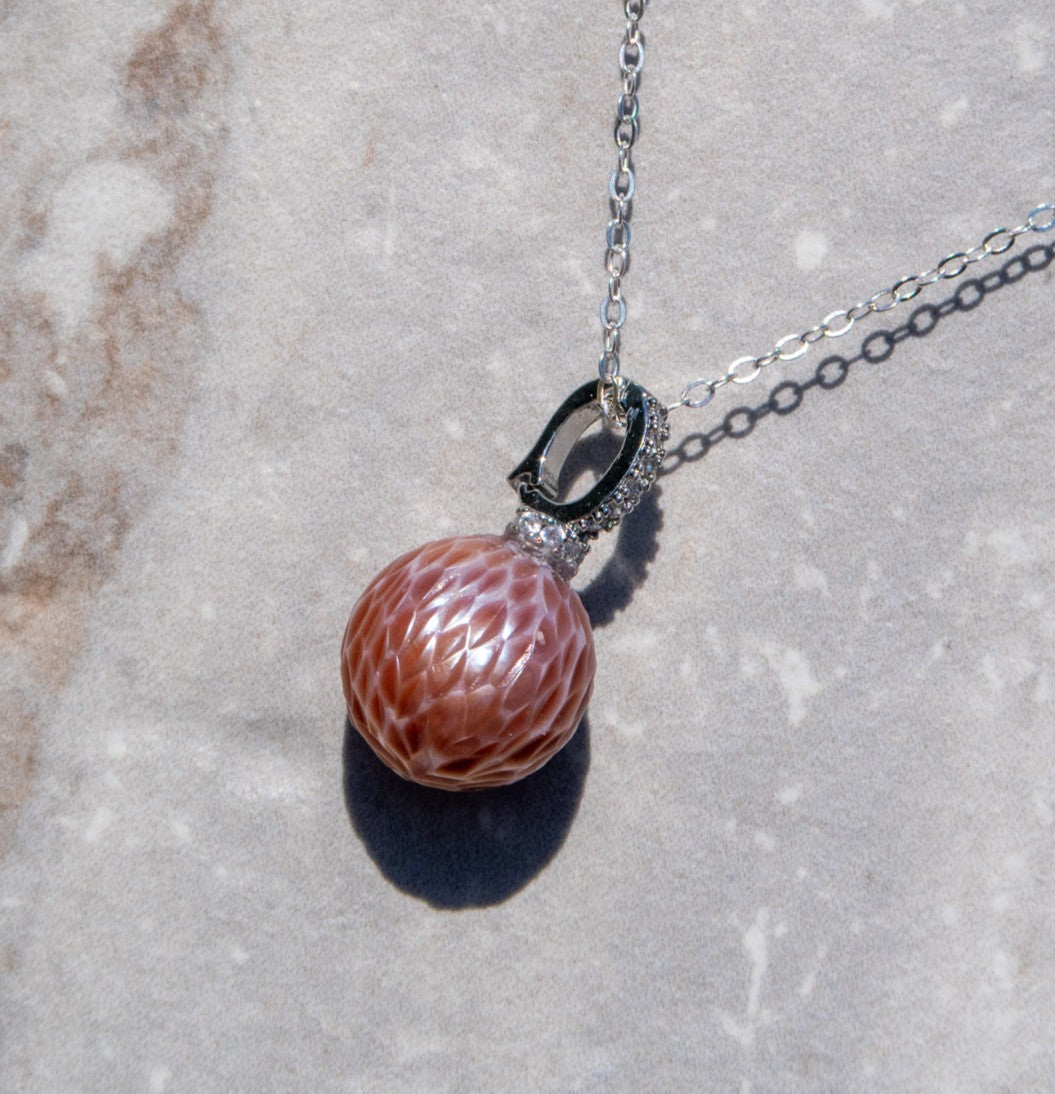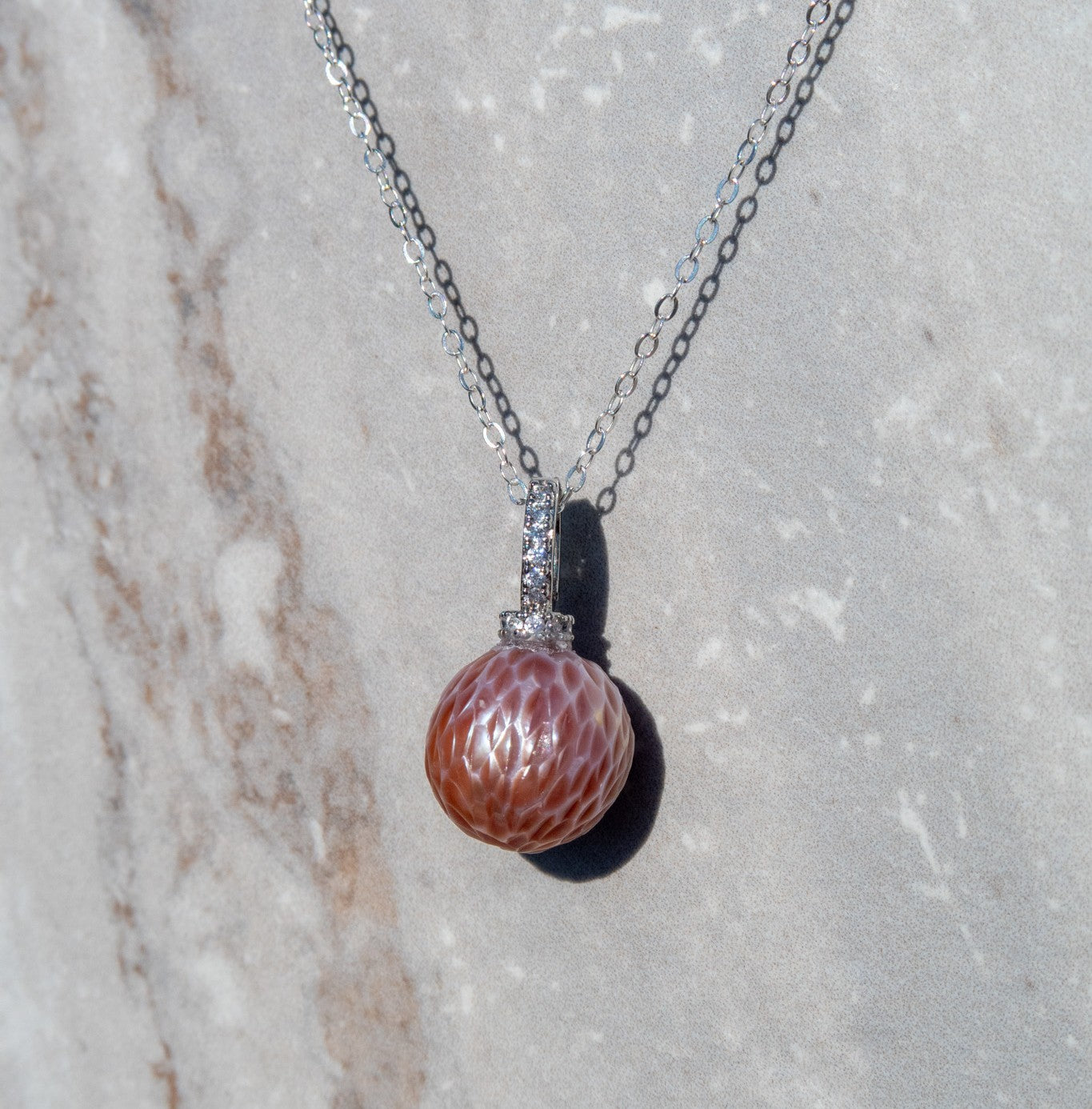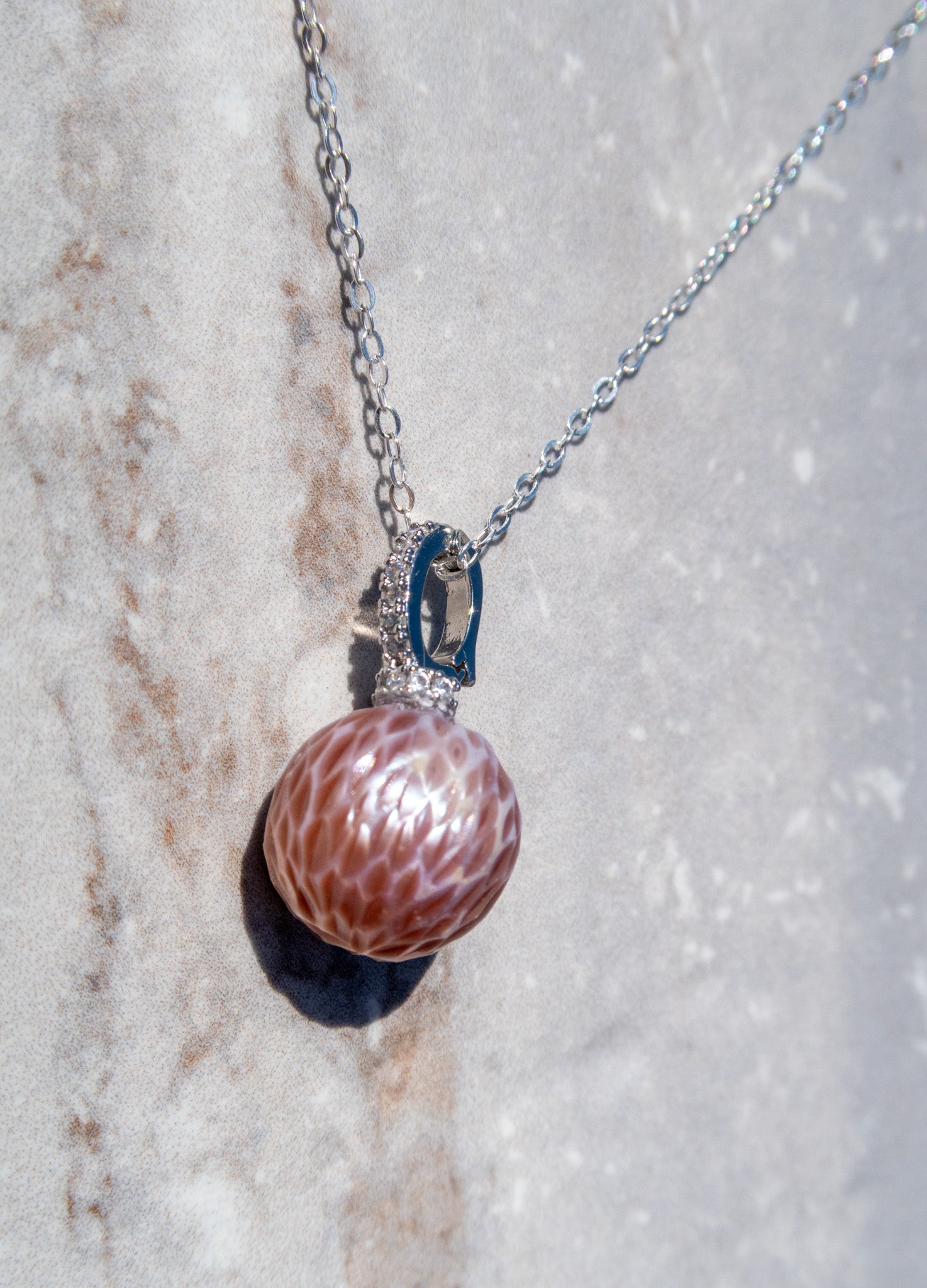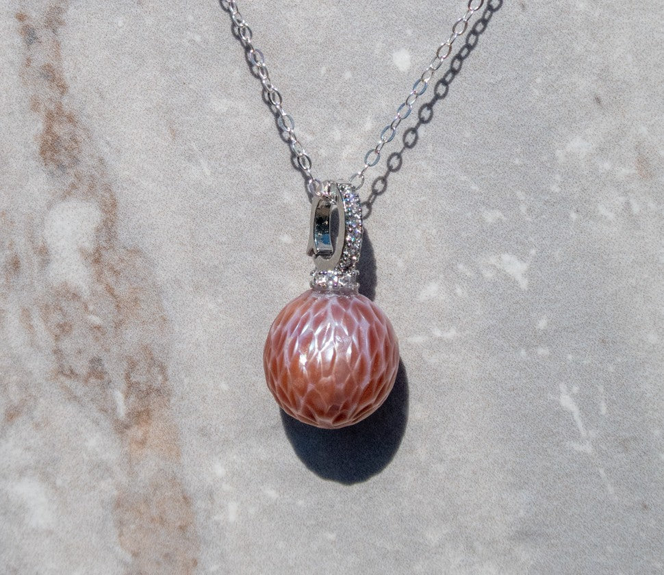 This 18-inch sterling silver necklace features a stunning hand-carved 12.5mm Lavender Edison pearl, crafted with the rare and intricate dragon scale carving technique.