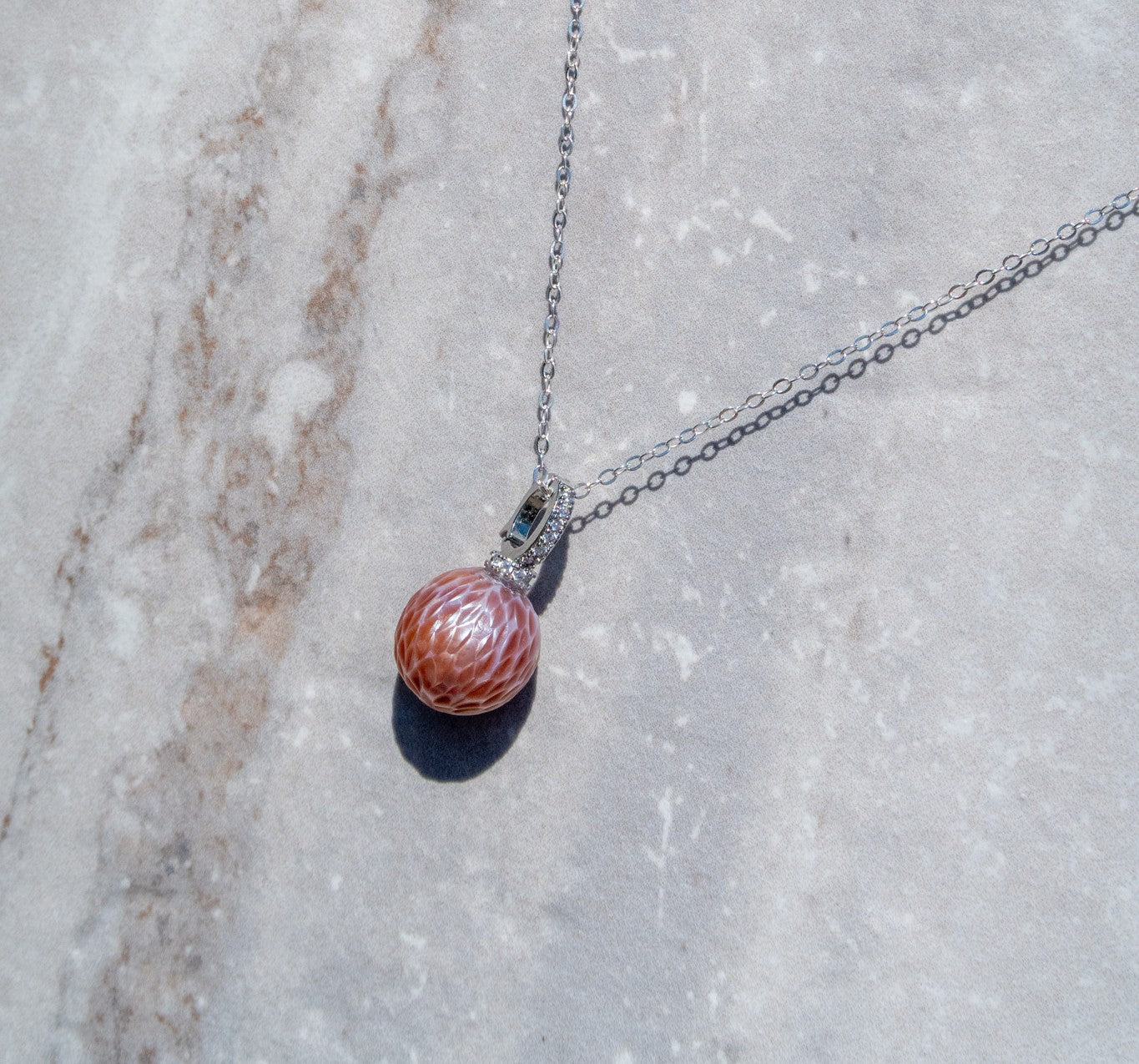 The pearl glows with its natural purple luster, revealing soft overtones of rose, lavender, and champagne that shimmer with every movement. Each curve and carve catches the light, creating a mesmerizing, scaled texture that’s both bold and feminine.✨ A true collector’s piece—delicate, detailed, and full of magic.