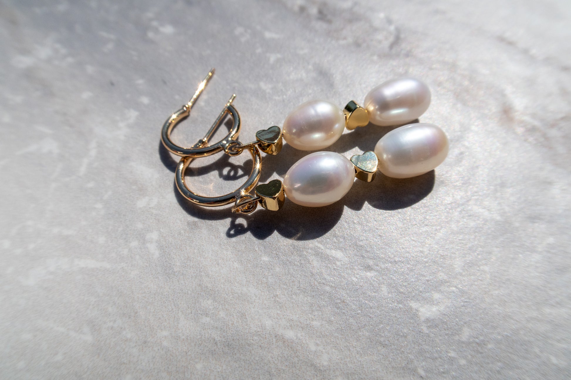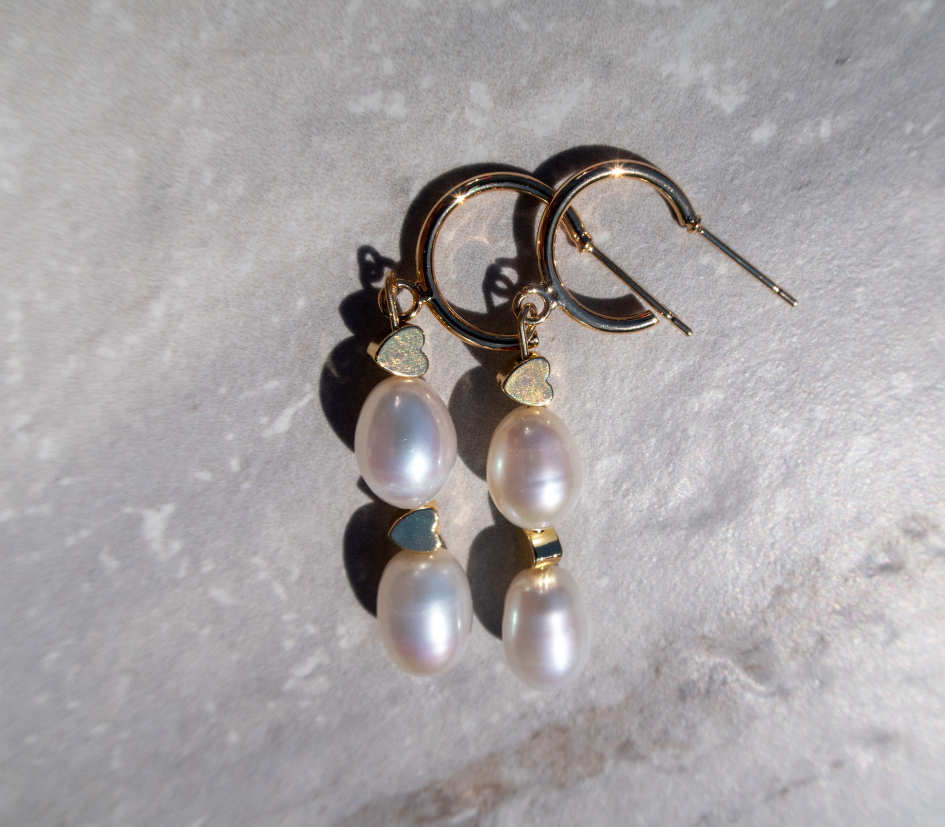 We've paired the timeless elegance of natural white freshwater pearls with adorable little gold heart beads, creating a look that's both sweet and sophisticated. The pearls add a touch of classic luster, while those tiny hearts bring in a playful, loving vibe. These hoops are light, comfortable, and perfect for adding a touch of everyday whimsy to your style.