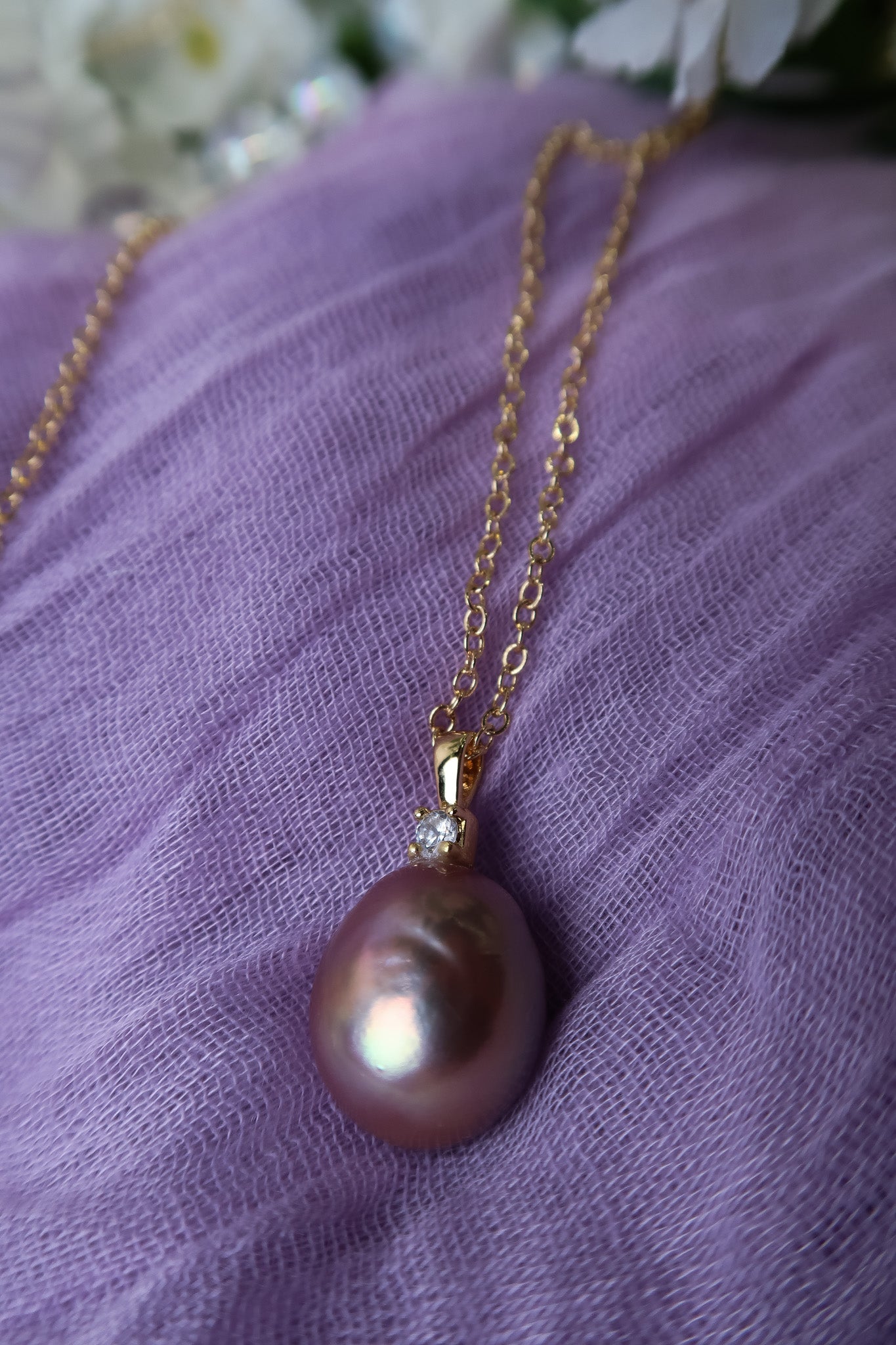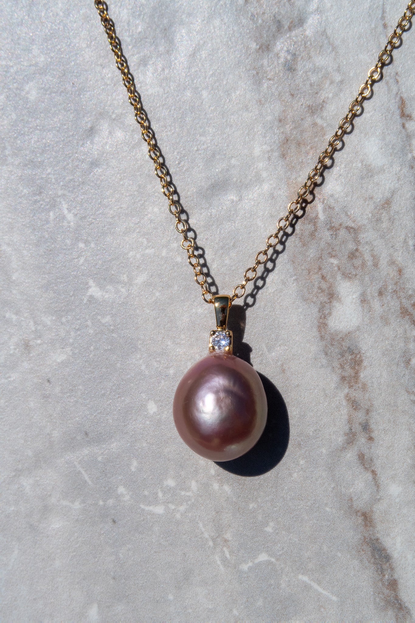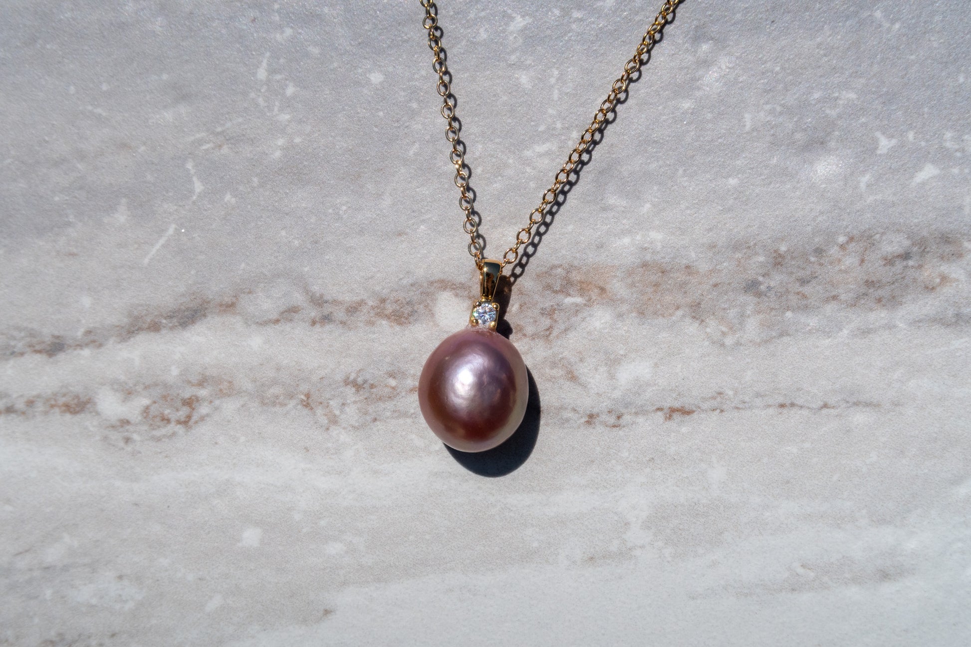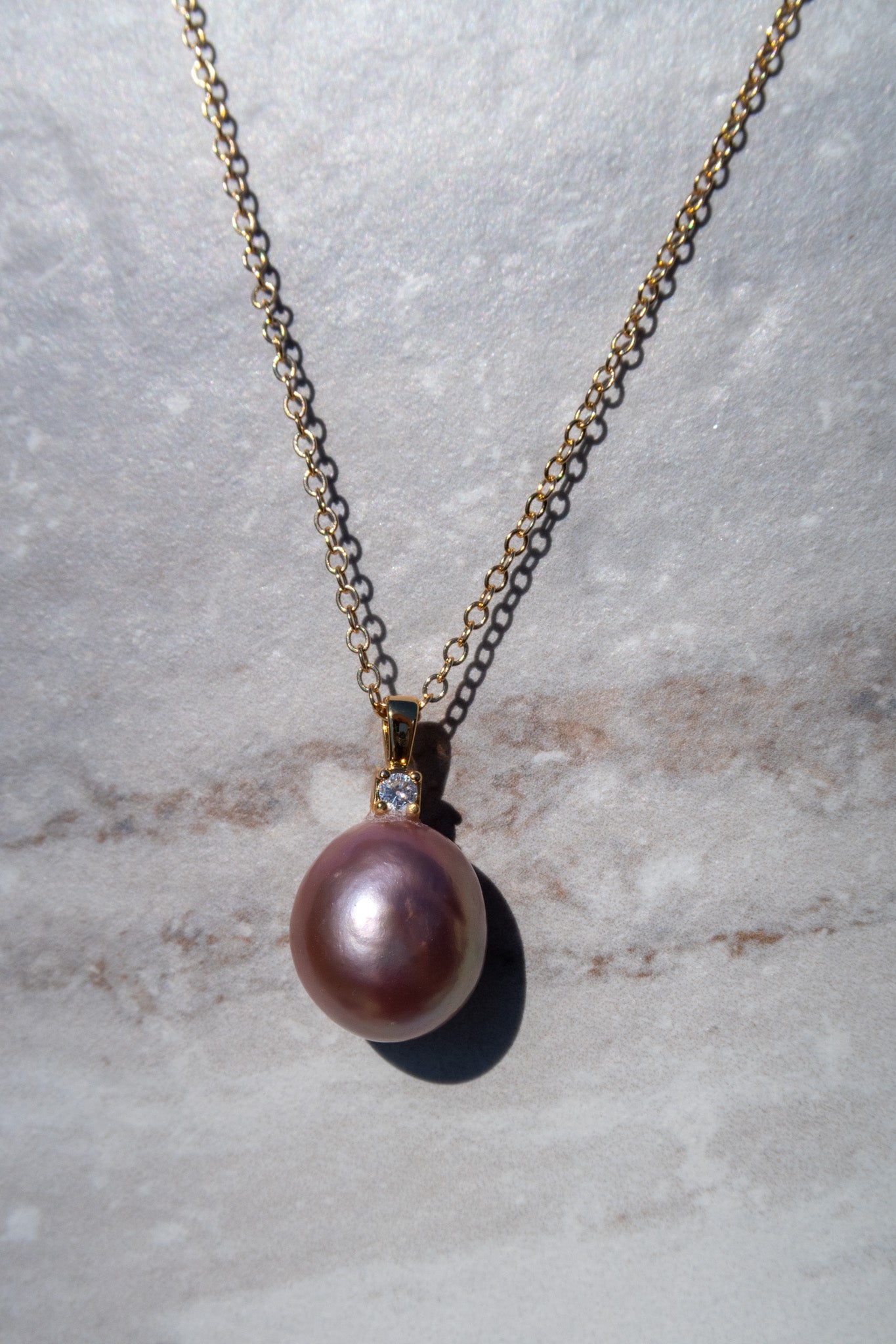 Prepare to be enchanted by this king-sized (15.5mm) Natural Edison Pearl Pendant Necklace! This impressive pearl showcases a breathtaking natural rose gold & lavender luster, a soft and ethereal glow with hints of delicate purple.