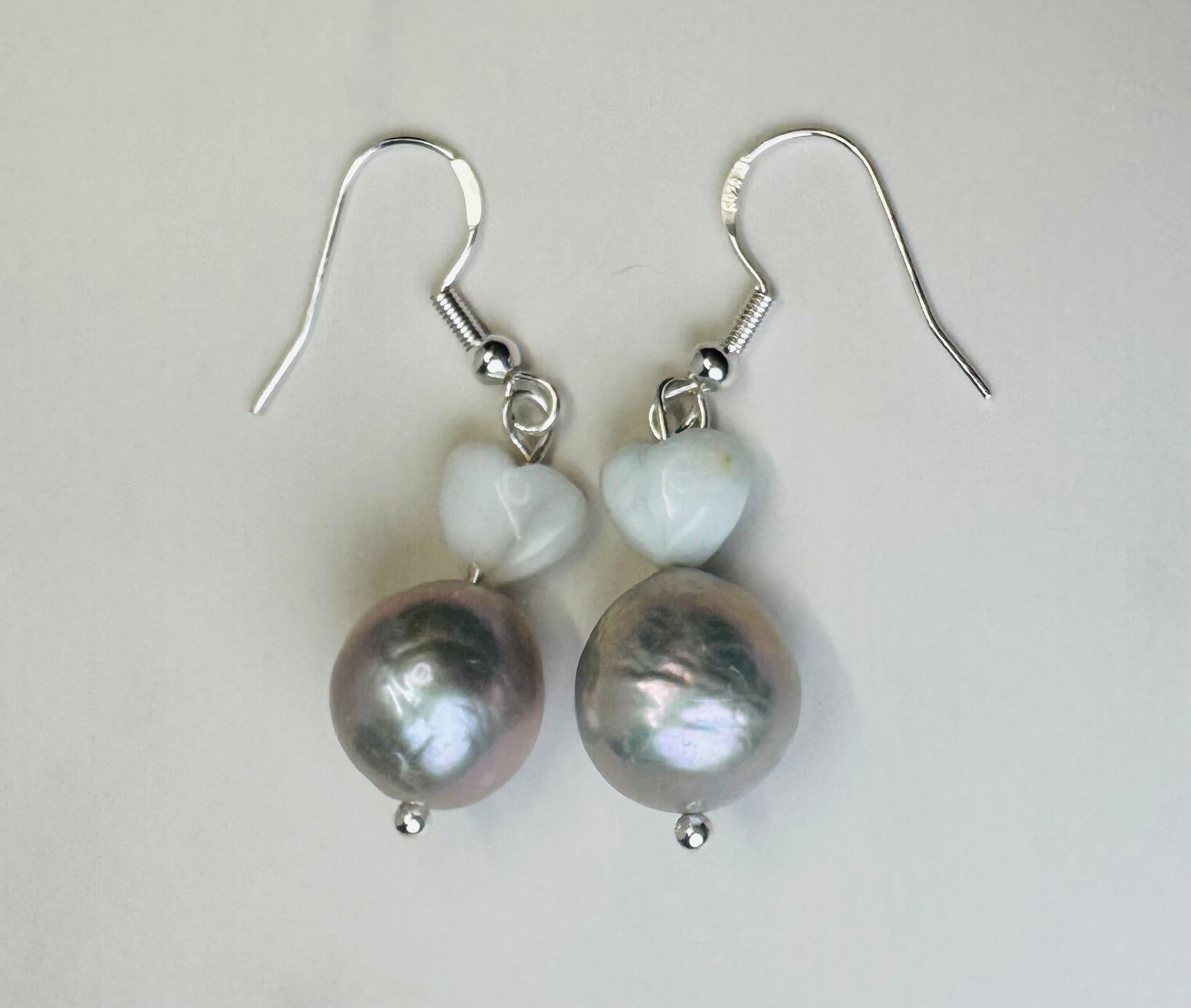 These Silver Blue Pearls & Larimar Heart Earrings combine the organic beauty of silver-blue freshwater pearls with the serene charm of larimar heart accents. Handcrafted with care, they feature 925 sterling silver components for durability and timeless elegance. The unique blend of materials and soft hues makes them a versatile accessory suitable for any occasion.