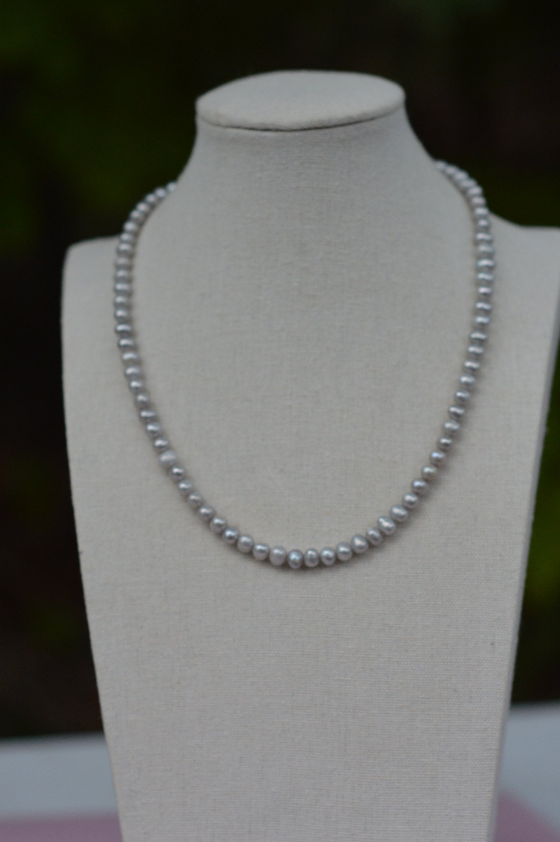 Sleek, modern, and versatile, this Silver Freshwater Pearl Necklace is a perfect accessory for both men and women. Featuring luminous 6mm silver pearls hand-strung for a smooth, elegant flow, this necklace brings a contemporary edge to classic pearl jewelry.