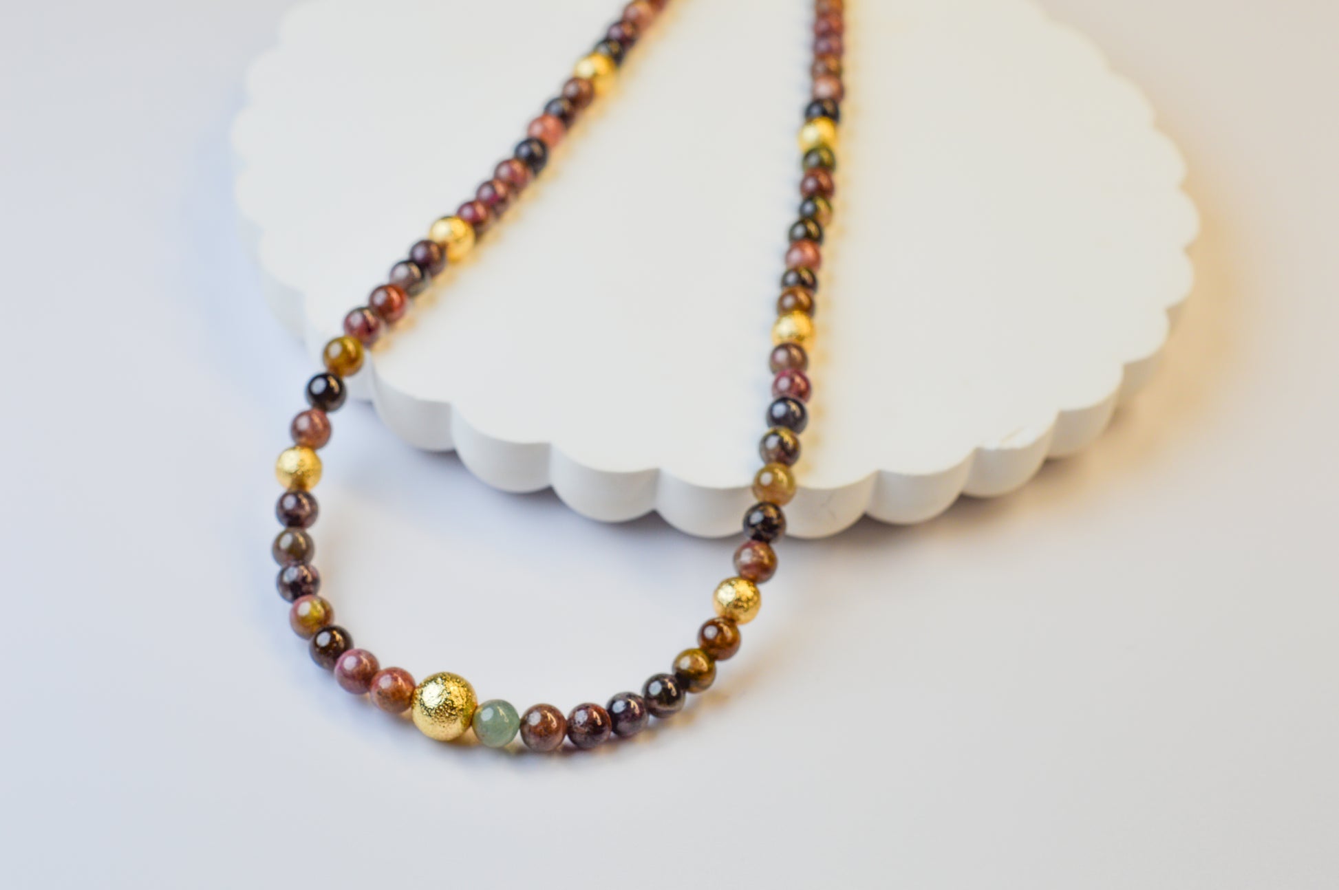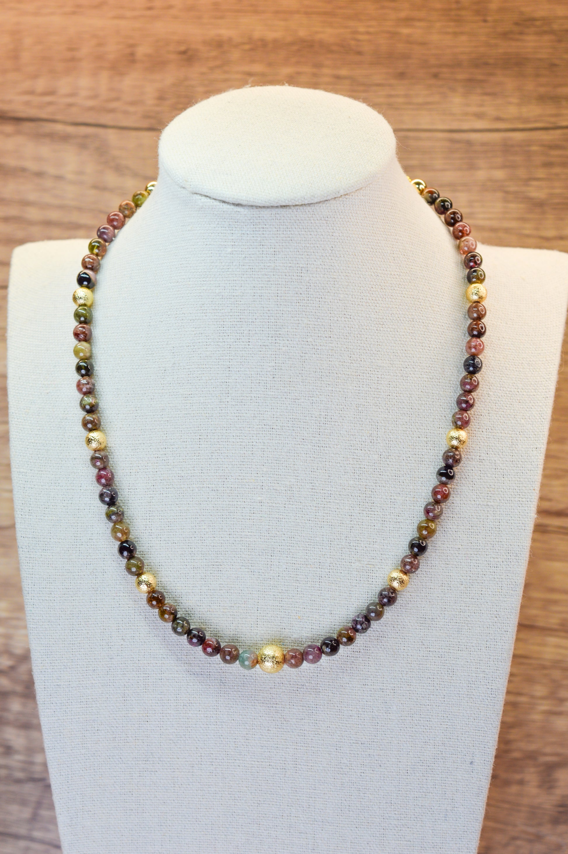 Get ready to fall head over heels for this vibrant Multi-Color Tourmaline Necklace! It's like wearing a little slice of joy around your neck. Each 5.5mm tourmaline bead is a tiny marvel of natural beauty, bursting with a spectrum of rich, earthy tones – think deep plums, warm greens, sunny golds, and subtle browns. No two beads are exactly alike, making your necklace truly unique!