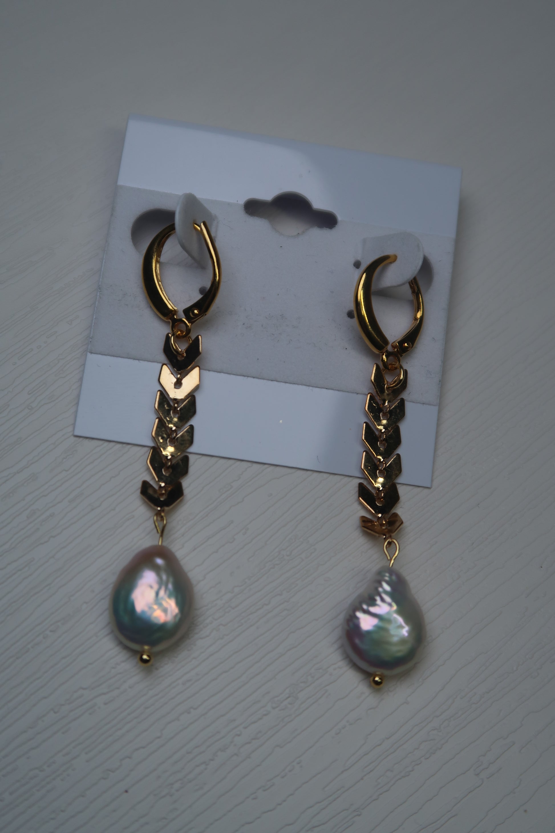 These elegant freshwater pearl dangle earrings feature a stunning combination of white with pink hues. Perfect for adding a touch of sophistication to any outfit. Set in gold plated 925 hoops.