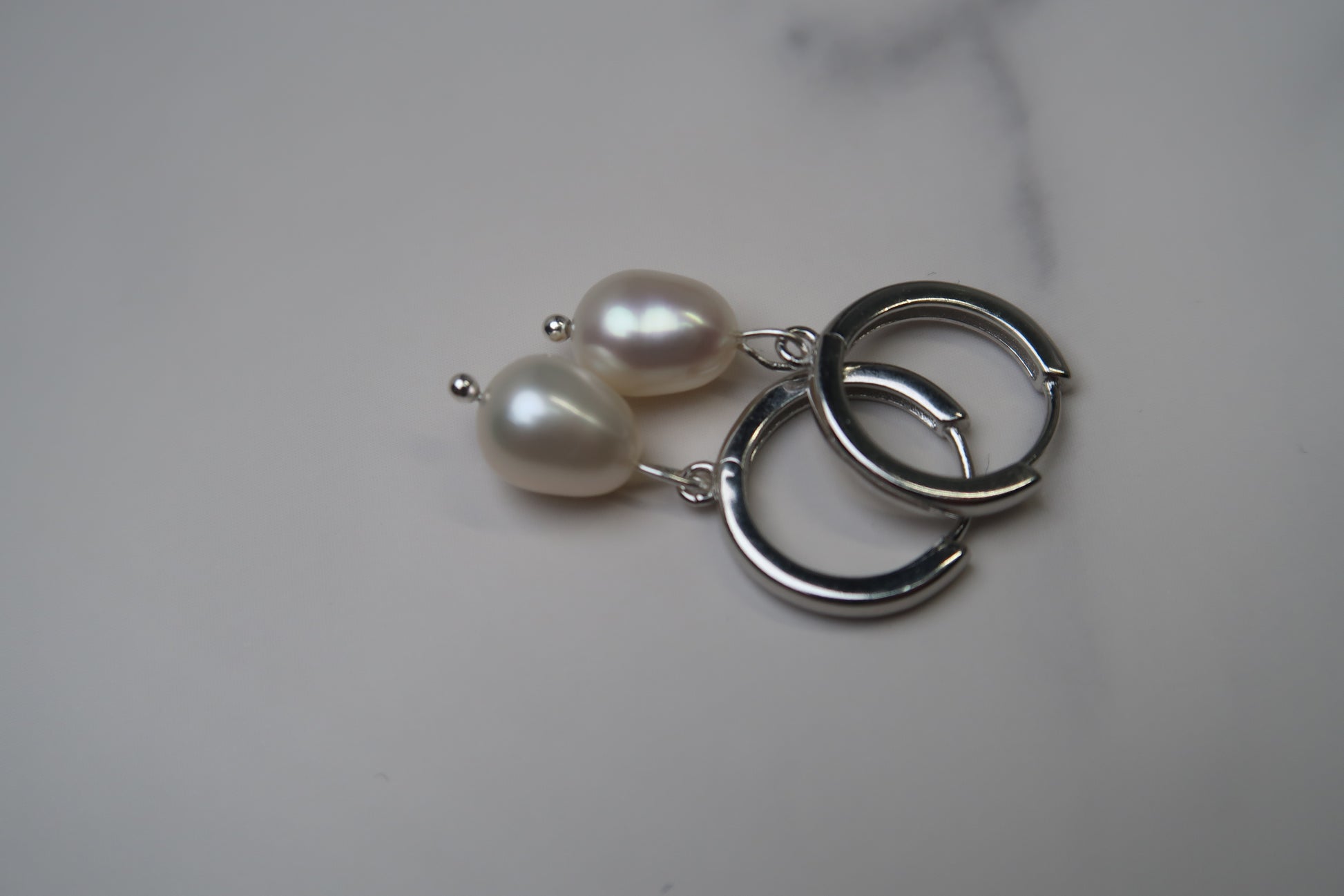 Elevate your jewelry collection with these exquisite natural white freshwater pearls, delicately paired with elegant sterling silver hoops. Each pearl showcases its own unique luster and subtle variations in color, reflecting the organic beauty of nature.